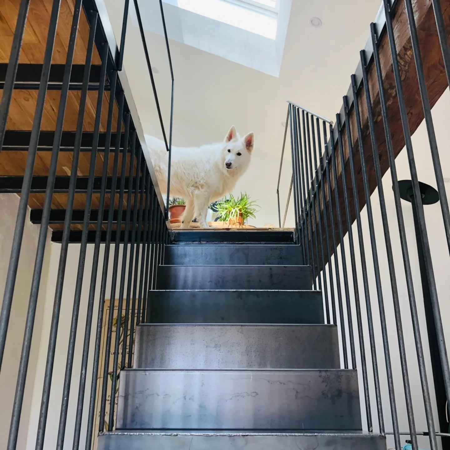 Escalier suspendu acier brut Pour cet escalier suspendu, une structure a d’abord été constituée pour recevoir un plancher en châtaigner